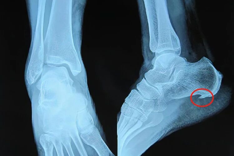 即“足跟骨刺”,当足跟关节出现磨损、破坏后,人体会进行自我修复、硬化与增生,从而形成足跟骨刺,是一种自然的老化现象。