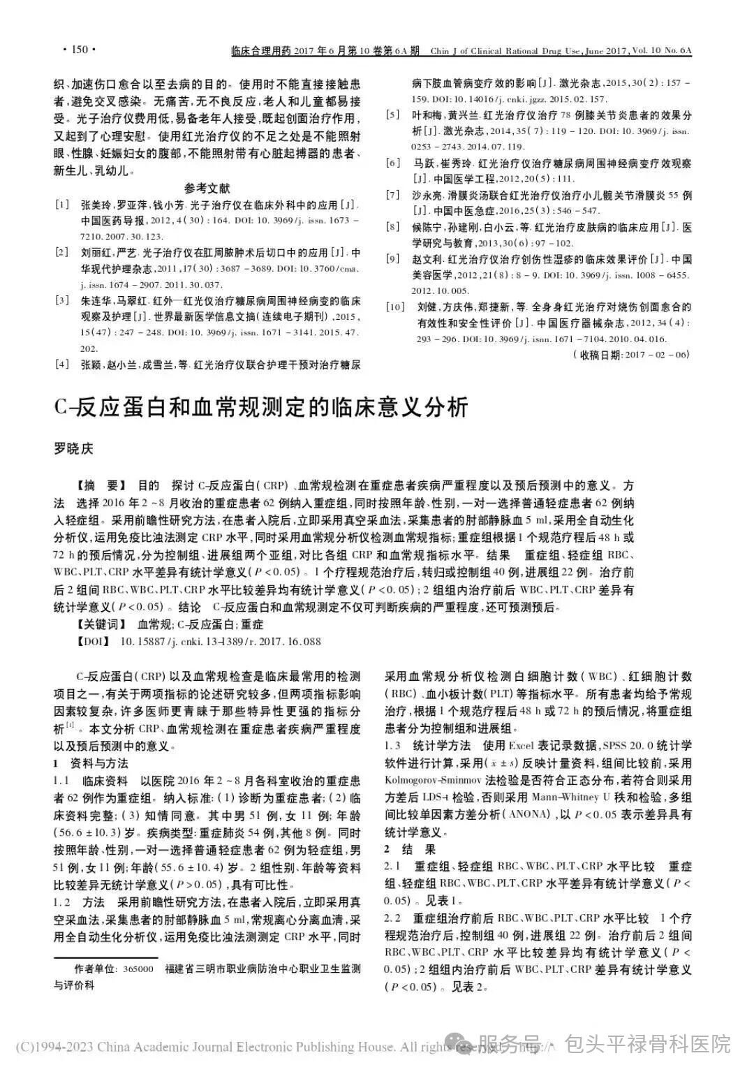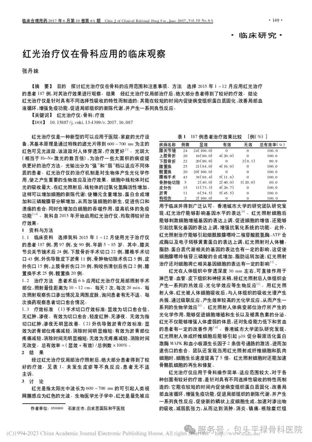 [3] 张丹妹.红光治疗仪在骨科应用的临床观察[J].临床合理用药杂志, 2017,10(16):2.DOI:CNKI:SUN:PLHY.0.2017-16-092.