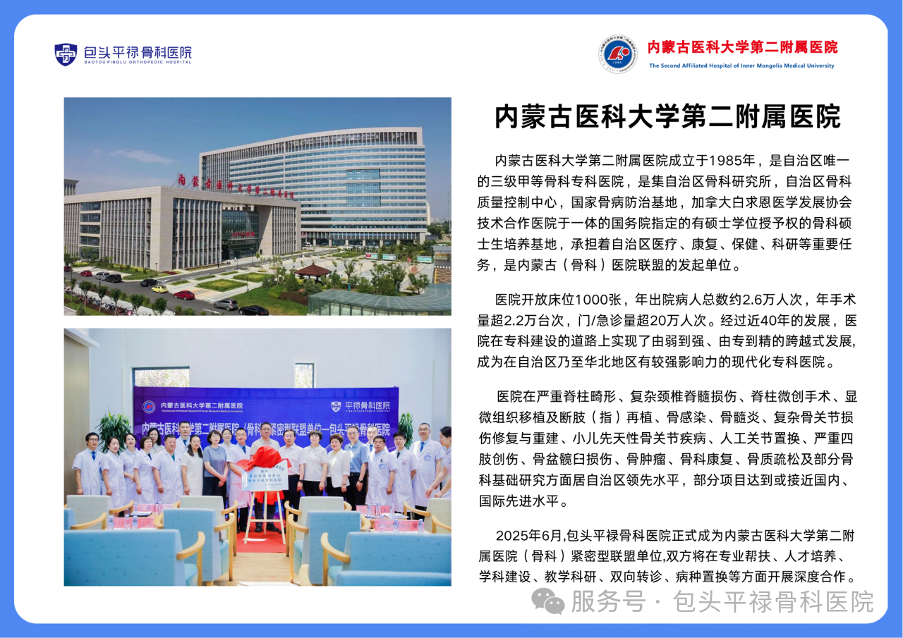 为积极响应“打造医疗高地”战略号召,推动优质骨科医疗资源普惠鹿城百姓,我院与内蒙古医科大学第二附属医院(骨科)紧密型联盟合作正式落地!