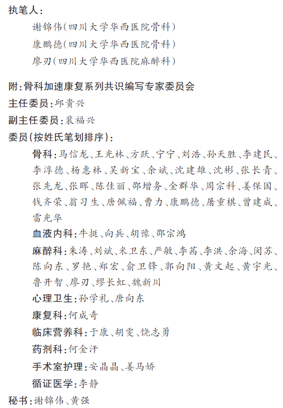 国家卫生健康委加速康复外科专家委员会骨科专家组,